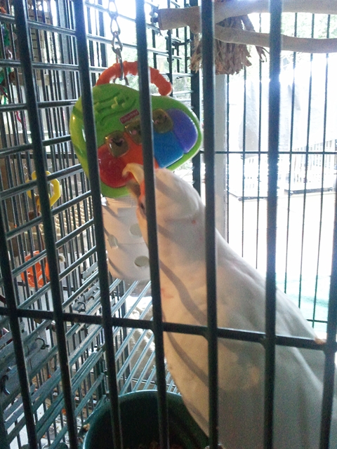 He is also incredibly fast at solving foraging issues. I have many foraging toys for him and try to limit his feeding to this type of activity. Other than the soft cooked foods, most of his dry food is placed inside foraging toys. The newest one was recently purchased from Cavalier Bird Toys. http://store.cavalierbirdtoys.com/foragingtoys.html
